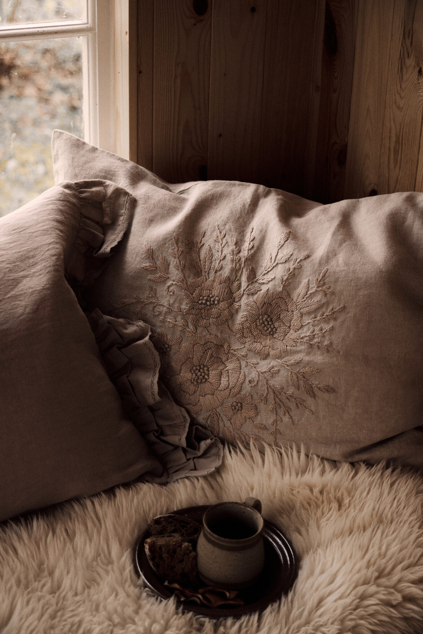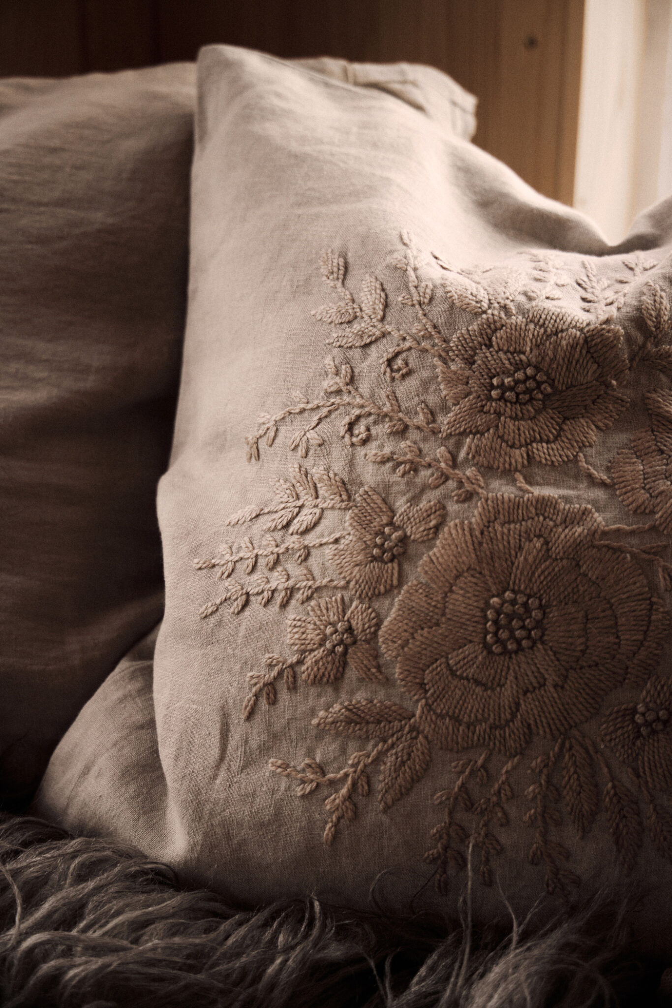 Floret-broderede pudebetræk er lavet i rent blødt hør fra Femme Facon.