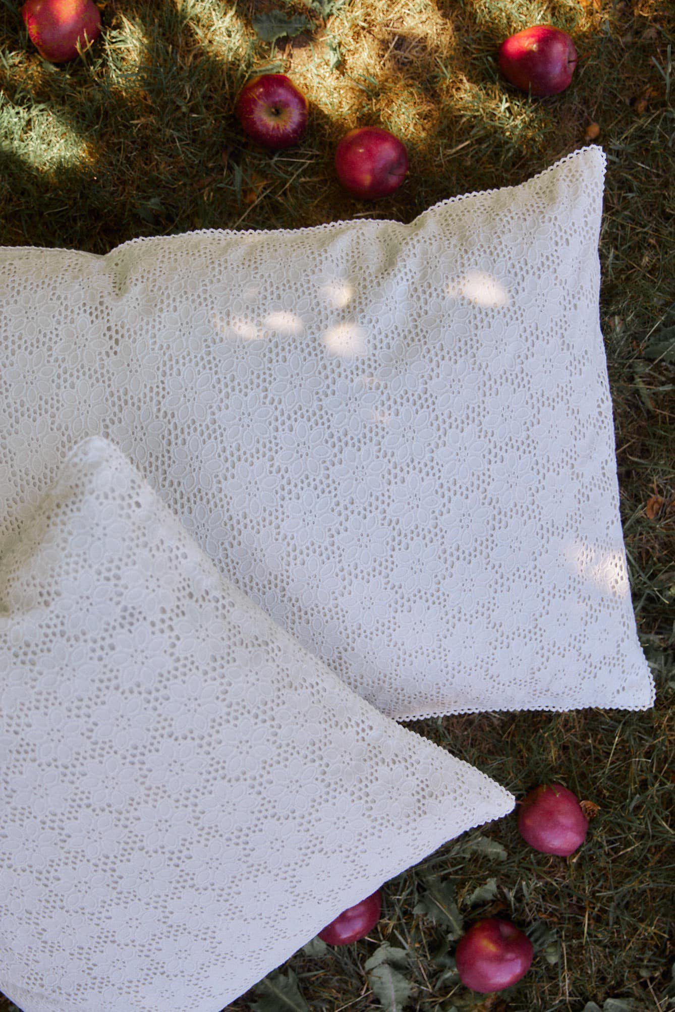 Dahlia-broderikollektion er lavet i blød kraftig bomuldsbroderie anglaise, dekoreret med en blonde langs kanterne.