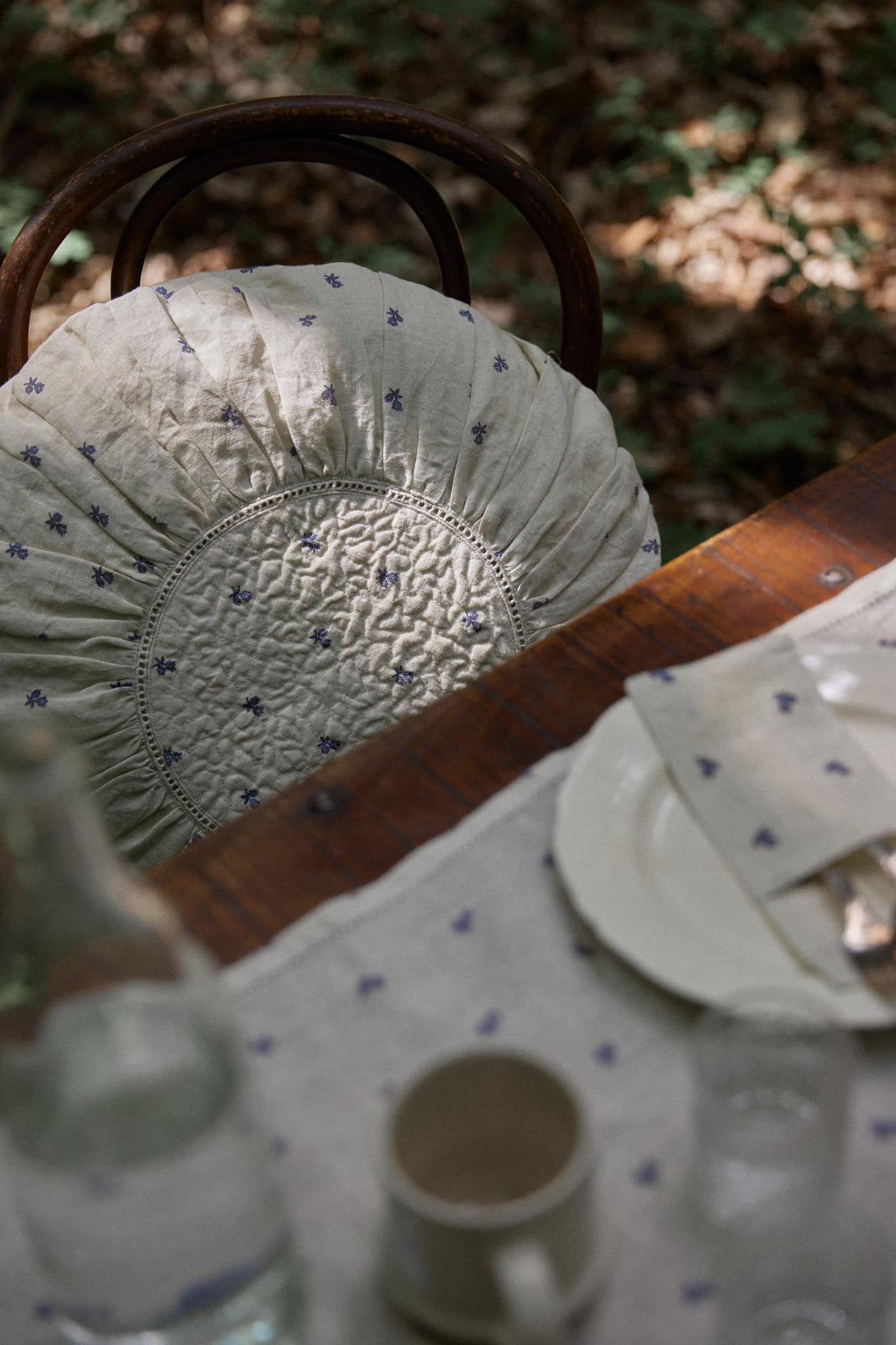 Lily salvie-kollektion er lavet i blødt cremefarvet hør med et overordnet blåt blomsterprint og små falmede cremeprikker.