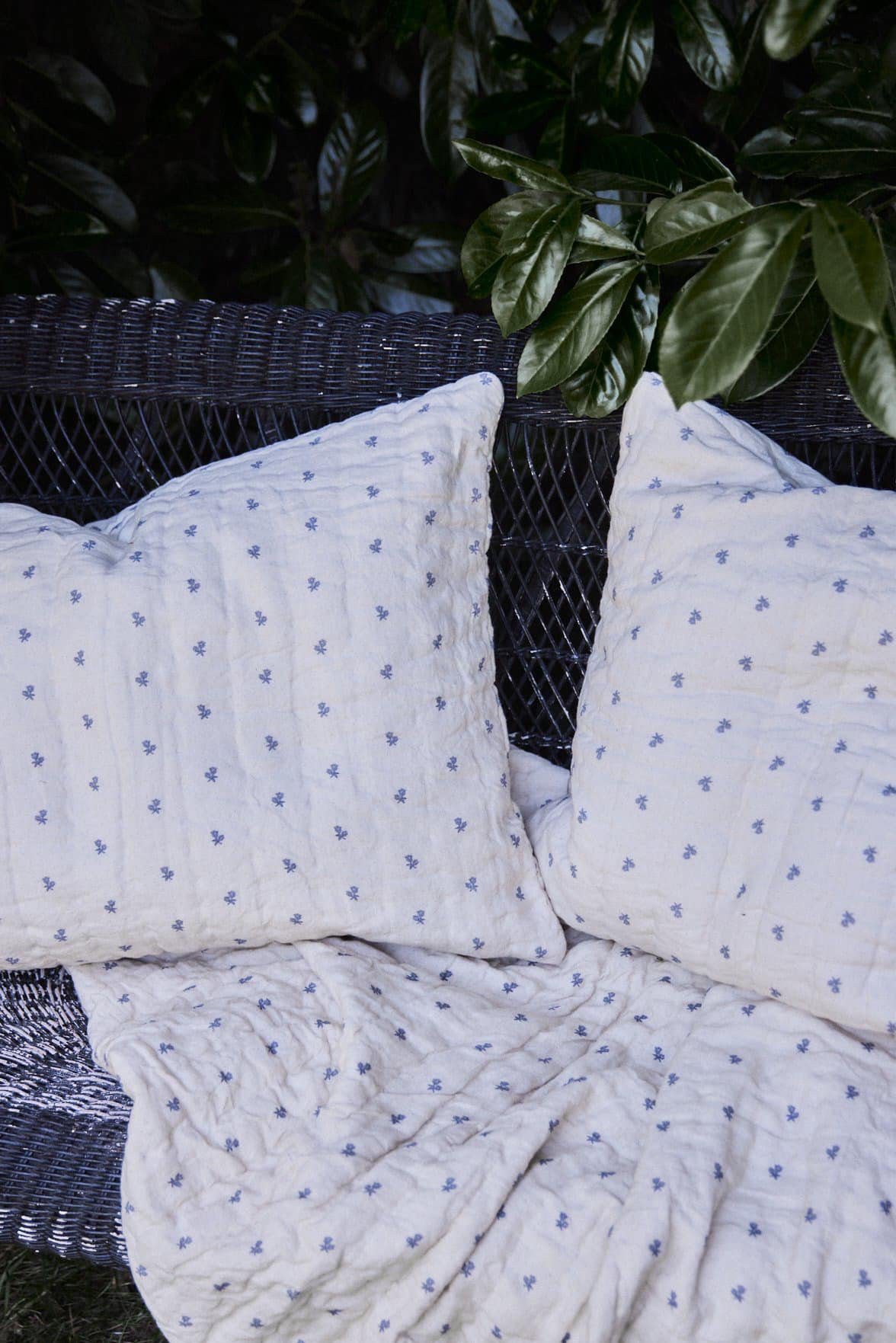 Smukt quiltet pudebetræk med blomsterprint fra Femme Facon. Det smukke blomstrende print er designet med inspiration fra gamle svenske tapeter og trykt på blødt økologisk...