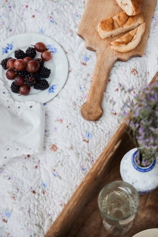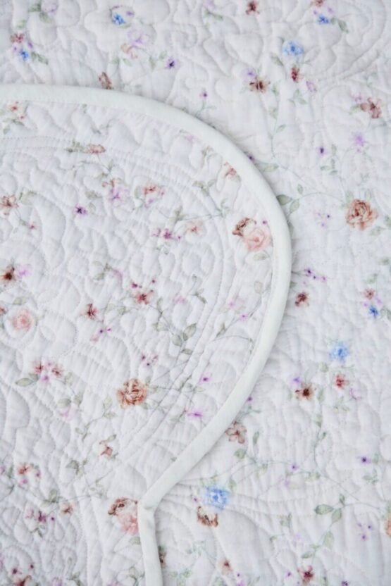 Quilten har det fineste sommerprint i ren økologisk bomuld som er inspireret af marker dækket med vilde blomster. Farvepaletten giver følelsen af sommervibes og glade tanker.